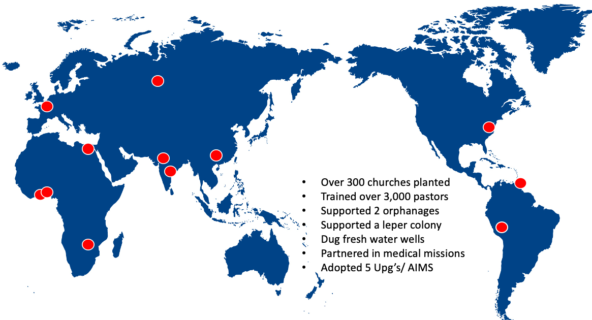 Global Harvest Partners was founded by Dennis R. Jones with the goal of developing strategic partnerships that would impact the world with the Great Commission of Jesus Christ.Pastor Bill and Dennis have served in global missions for over 30 years. This map illustrates their mission activity in different regions around the world.